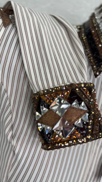 Classy and flattering-this stretch cotton based shirt features slimming, vertical bronze stripes. Embellished cuffs, collar and shoulder add a bit of glitz and a versatile accent for the horsemanship, reining, trail, etc. Stand out from the crowd!