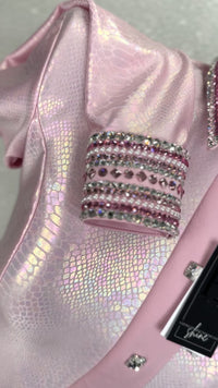 This gorgeous shirt packs a punch! The sophisticated Baby Pink Stretch Spandex has a unique snakeskin print and comfortable stretch. The cuff and collar are dripping in coordinating crystals. Crystal faux buttons on the placket, cover an easy on/off hidden front zipper.