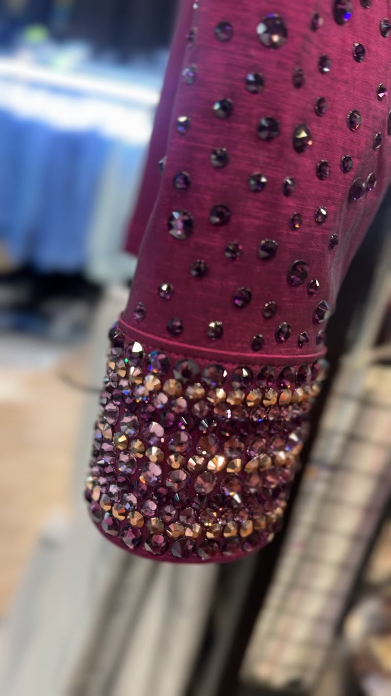 This GLITZY Dark Berry Day Shirt is bringing the sparkle. It features a fully embellished cuff and collar dripping in crystals upgraded with scattered crystals on the shoulders and sleeves and shoulder fringe. Perfect for the reining, western riding, pleasure or trail. The stretch taffeta fabric gives a crisp, clean look and structured feel with a generous amount of support. Would pair beautifully with navy, chocolate or black!