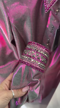 This gorgeous shirt packs a punch! The metallic taupe with pink reflect Melted Metals Stretch Spandex is super versatile and comfortable. The cuff and collar are dripping in coordinating crystals. Color matched, monochromatic faux buttons on the placket, cover an easy on/off hidden front zipper.