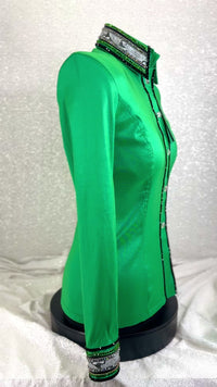 Colorful, but not too colorful! The Kelly Green taffeta base offers a pop of color to stand out from the crowd and gives a crisp, structured feel. Accented with black and white snakeskin, black and grey to let you shine in the show pen. Embellished cuff, collar and placket.