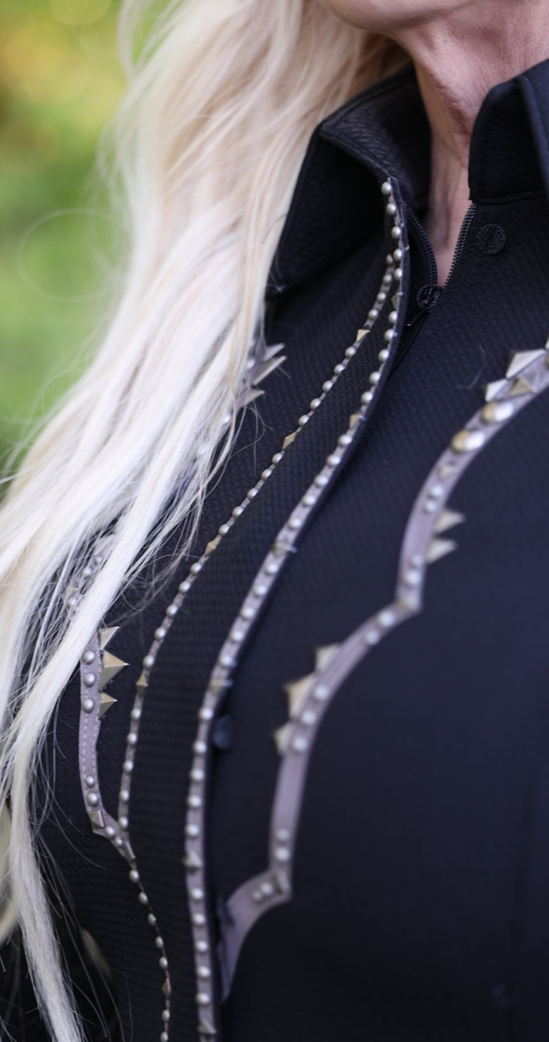 You can never go wrong with a fun black shirt! Our SOUTHWESTERN Black & Grey Day Shirt is a statement piece for both in and out of the show arena! The grey ultrasuede detail is super unique and accents the cuffs, collar, placket and retro yoke along with grey studs for an edgy elements. The perfect fashion forward statement for the ranch classes, retro look for the trail or for a night out on the town! An absolute MUST HAVE!