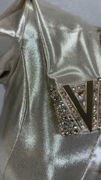 This gorgeous shirt packs a punch! The metallic Blonde Latter Melted Metals Stretch Spandex is super versatile and and comfortable in a very light platinum blonde type color. The cuff and collar are dripping in coordinating crystals. Color matched, monochromatic faux buttons on the placket, cover an easy on/off hidden front zipper.