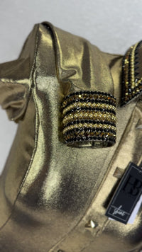 This gorgeous shirt packs a punch! The rich metallic Gold/Black Melted Metals Stretch Spandex is super versatile and and comfortable. The cuff and collar are dripping in coordinating crystals. Color matched, monochromatic faux buttons on the placket, cover an easy on/off hidden front zipper.