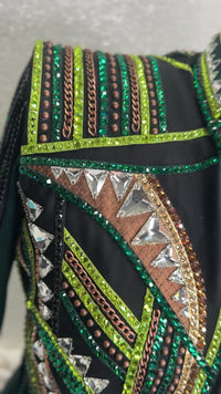 GREEN WITH ENVY! Check out this unique set which includes, day shirt, vest AND pad! The vest base is made of our medium weight stretch sculpting fabric and adorned in a variety of unique leathers, applique work and crystal. The shoulder fringe is completely detachable for a customizable look. The stretch taffeta shirt features a super unique retro yoke, cuff, collar and placket design.