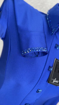 This royal blue spandex has a super strechy, comfortable feel with a slight sheen finish and just enough sparkle on the cuff and collar with crystal faux buttons down the front placket. Accented with color matched AB (for extra sparkle) crystals. OR switch the crystals to a different color! Use the re-order. option and leave color requests in the notes section).